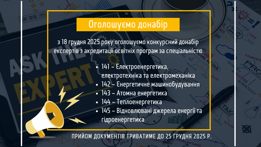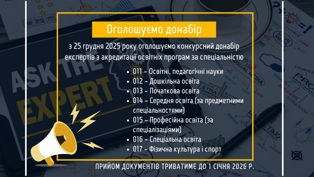 - Конкурсний донабір експертів з акредитації освітніх програм за певними спеціальностями 03.12-10.12.2025