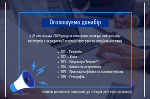 21.11.2025. Національне агентство із забезпечення якості вищої освіти оголошує конкурсний донабір осіб для включення до Реєстру експертів Національного агентства з числа науково-педагогічних, наукових працівників за наступними спеціальностям:
