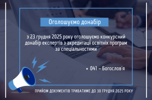 23.12.2025. Національне агентство із забезпечення якості вищої освіти оголошує конкурсний донабір осіб для включення до Реєстру експертів Національного агентства з числа науково-педагогічних, наукових працівників за наступними спеціальностям: