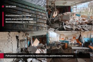 Уночі 16 лютого російські військові здійснили чергову атаку на головний корпус Херсонського державного університету. Унаслідок обстрілу зазнали руйнувань аудиторії фізико-математичного факультету та лабораторії, де готували майбутніх учителів і фахівців для українських шкіл.