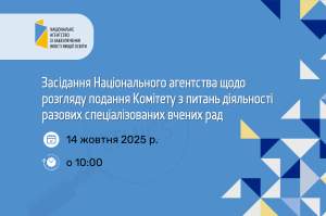 14 жовтня 2025 року відбудеться засідання Національного агентства щодо розгляду подання Комітету з питань діяльності разових спеціалізованих вчених рад про наявність порушень процедури захисту дисертації…