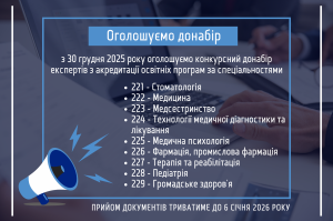 25.12.2025. Національне агентство із забезпечення якості вищої освіти оголошує конкурсний донабір осіб для включення до Реєстру експертів Національного агентства з числа науково-педагогічних, наукових працівників за наступними спеціальностям: Запрошуємо науково-педагогічних/наукових працівників закладів вищої освіти,…